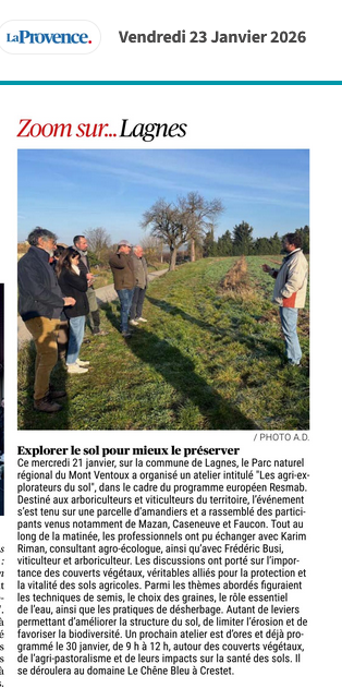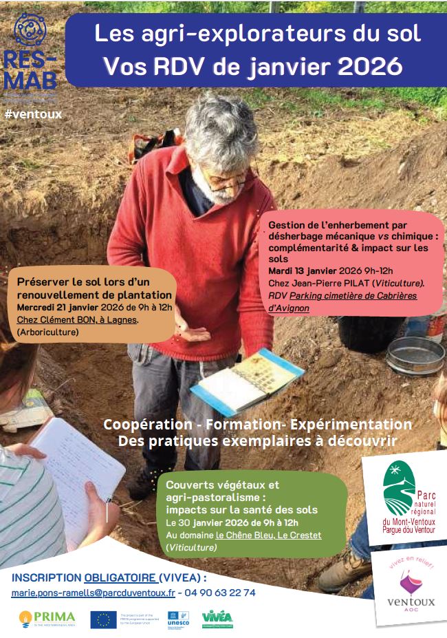 PARCOURS AGRI-EXPLORATEURS DU CLIMAT, MODULE SOLS RÉSILIENTS, projet bâti avec madame Marie PONS-RAMELLS – Chargée de mission « agriculture et climat » et Référente projet RES-MAB au PNR du Ventoux ainsi que Caroline Sage et Barbara Meyer-Soula du CFPPA Provence-Ventoux.